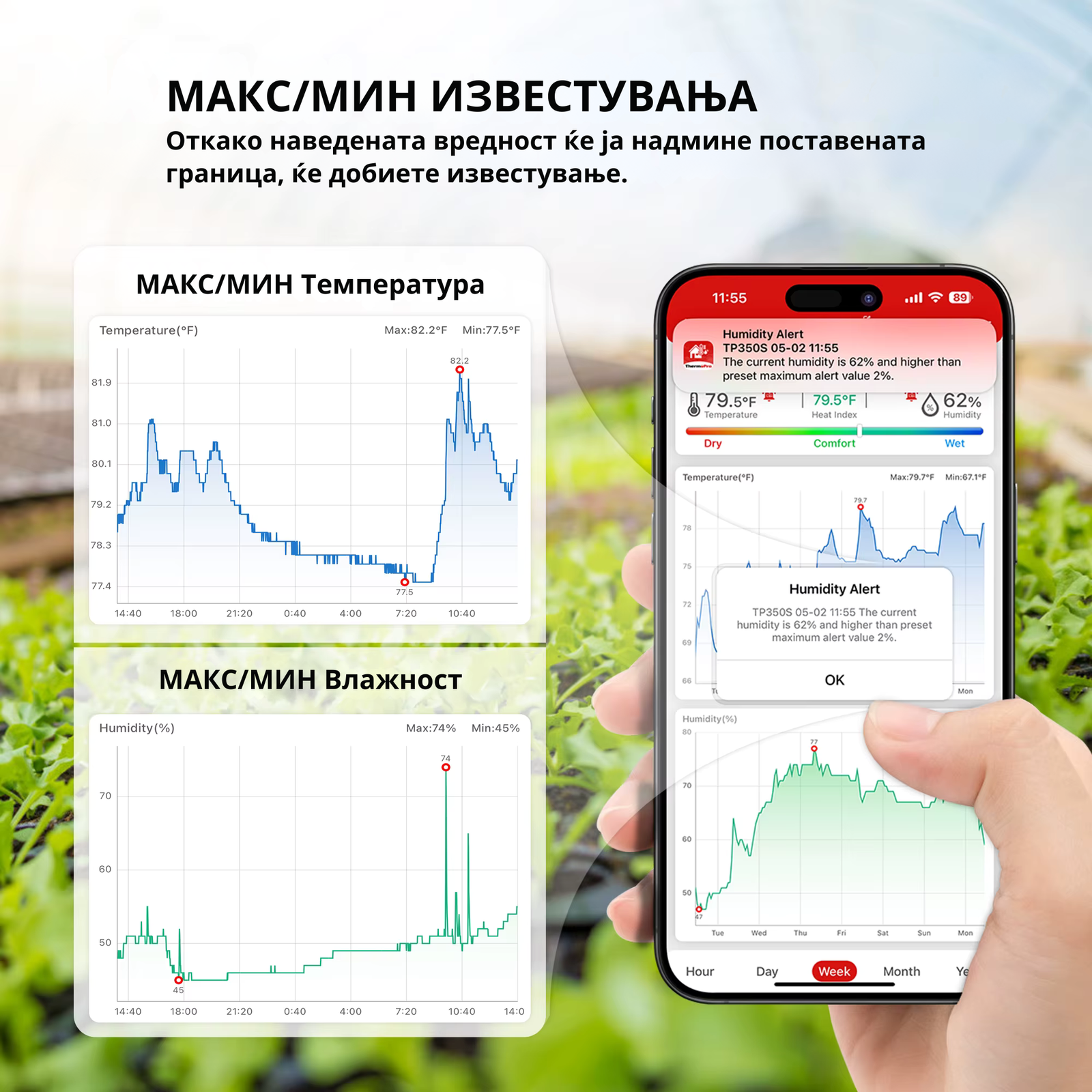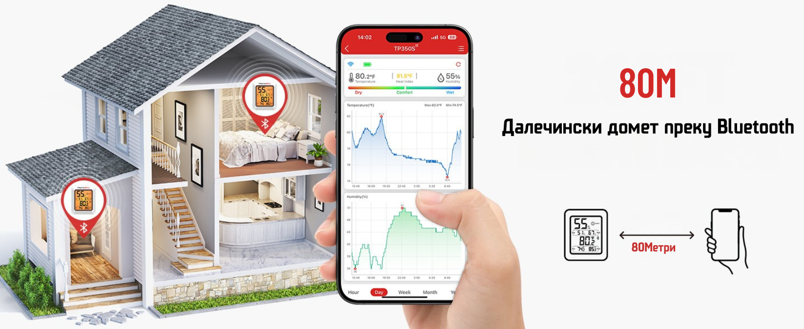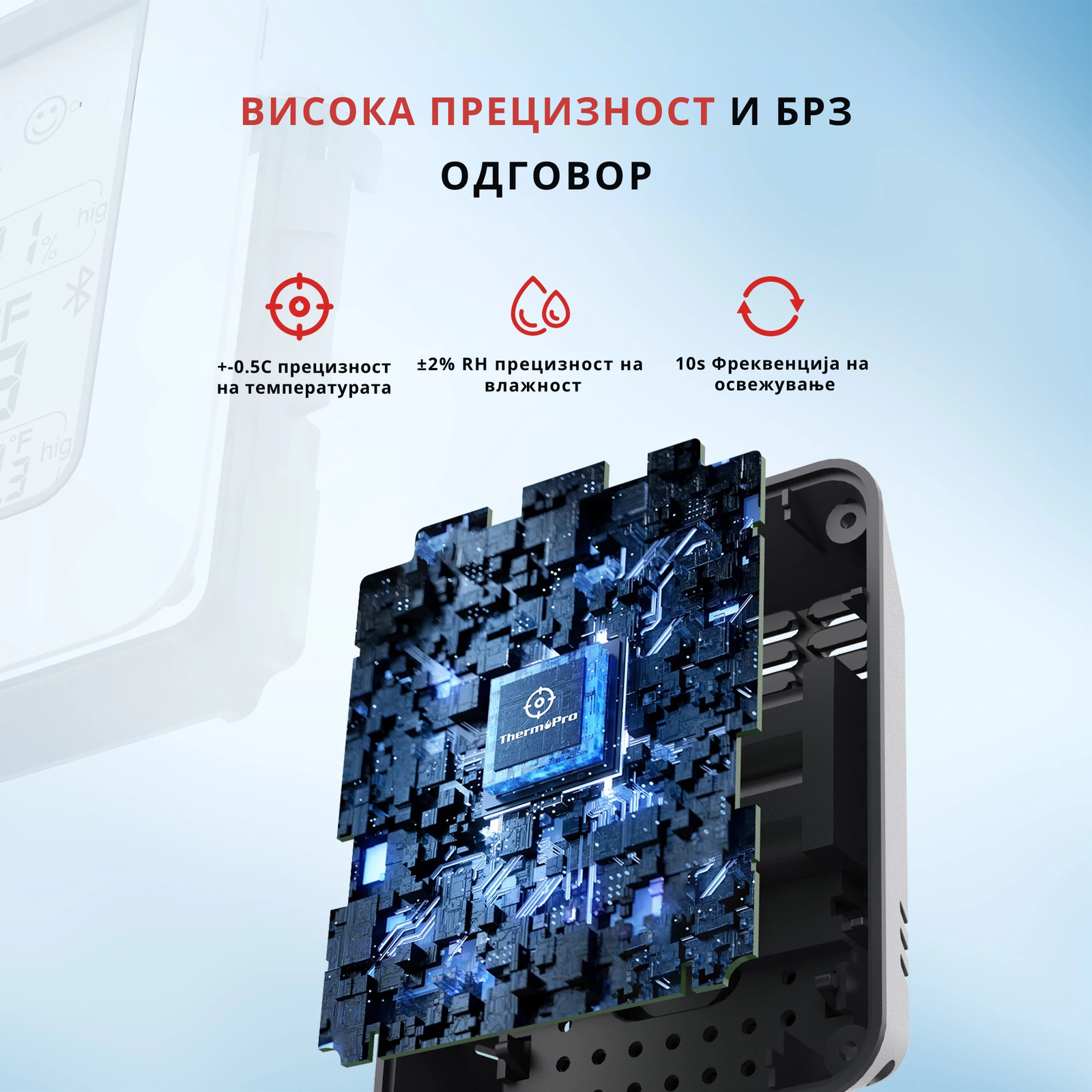 Опремен со напреден NTC сензор, овој Bluetooth термометар и хигрометар за внатрешна употреба обезбедува висока прецизност (±0,5°C за температура и ±2% RH за влажност), со автоматско освежување на податоците на секои 10 секунди.